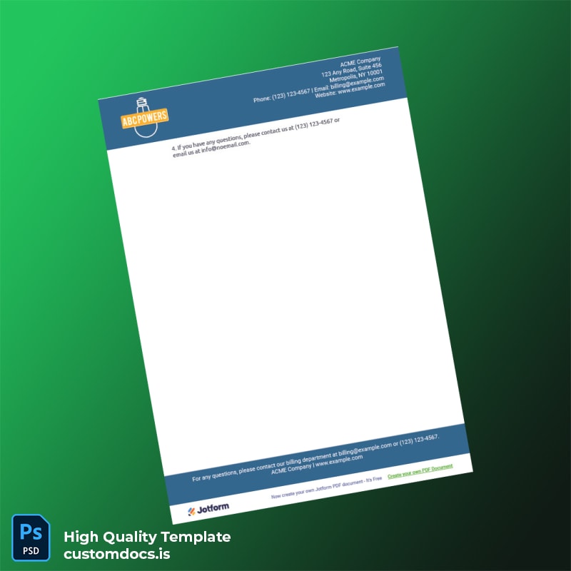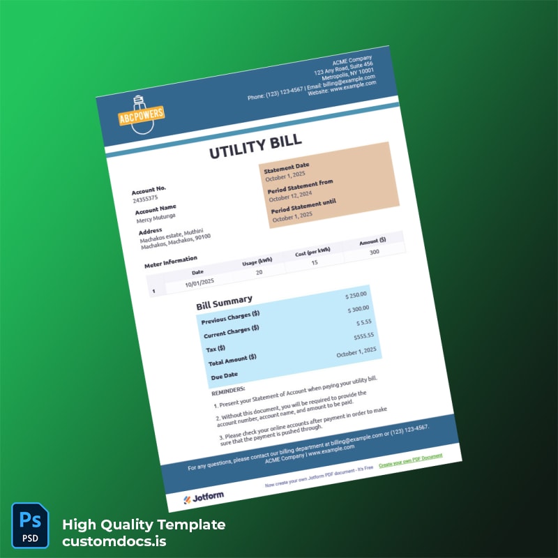 ACME Company Editable Utility Bill Template in Word and PDF Formats