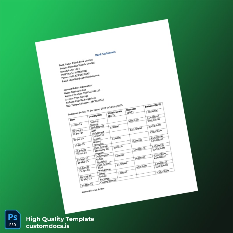 The Bangladesh Pubali Bank Limited Bank Statement Template offers a seamless solution for professionals needing an editable and reliable document for various financial requirements. Available in both Word and PDF formats, this template is designed to cater to the specific needs of creative and technical professionals worldwide.
