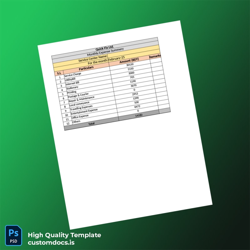 Bangladesh Quick Fix Ltd Editable Petty Cash Details Template in Word and PDF Formats
