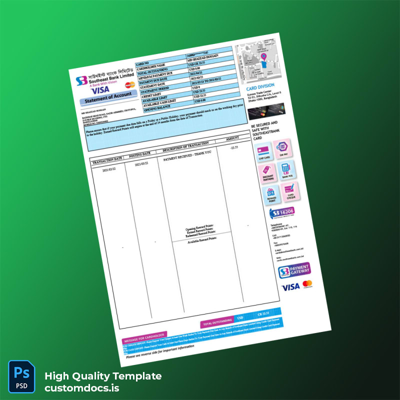 Are you struggling to provide accurate financial documentation due to lost or expired bank statements? Our Bangladesh Southeast Bank Credit Card Statement Template in both Word and PDF formats is your fast-track solution for producing professional documents with ease.