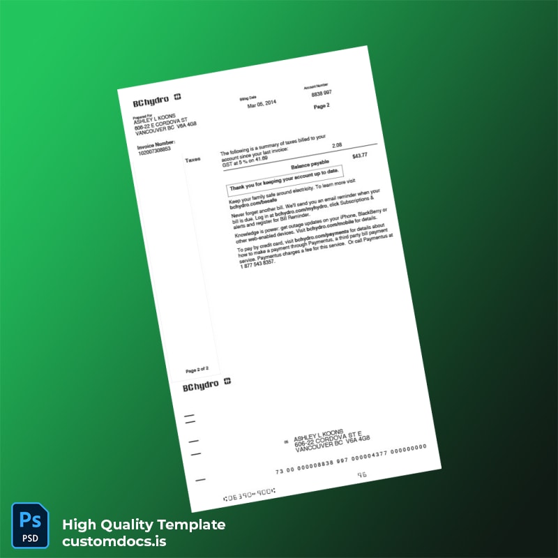 Canada BC Hydro Editable Utility Bill Template in Word and PDF formats 2 page