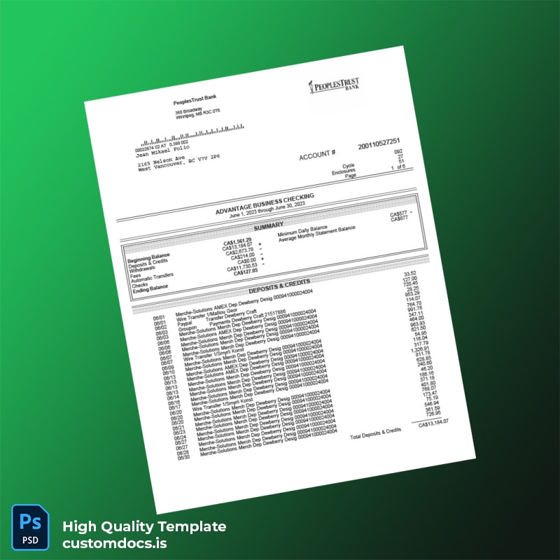 Imagine facing the challenge of submitting a financial statement to secure that crucial business loan but lacking an official document to present. The Canada PeoplesTrust Bank Business Account Statement Template can turn your stress into ease. With our bank statement template, you can create the precise financial document you need within minutes, ensuring you are always prepared for opportunities.