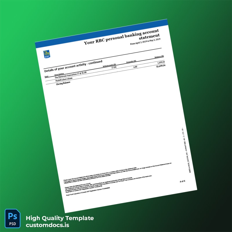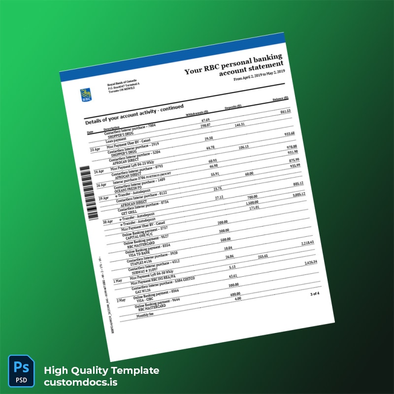 Don’t let the absence of proper documentation hinder your financial processes. Invest in the Canada RBC Personal Banking Account Statement Template today. For more options, explore our bank statement templates, or consider our 3 months bank statement PDFs and 6 months bank statement PDFs for added flexibility.