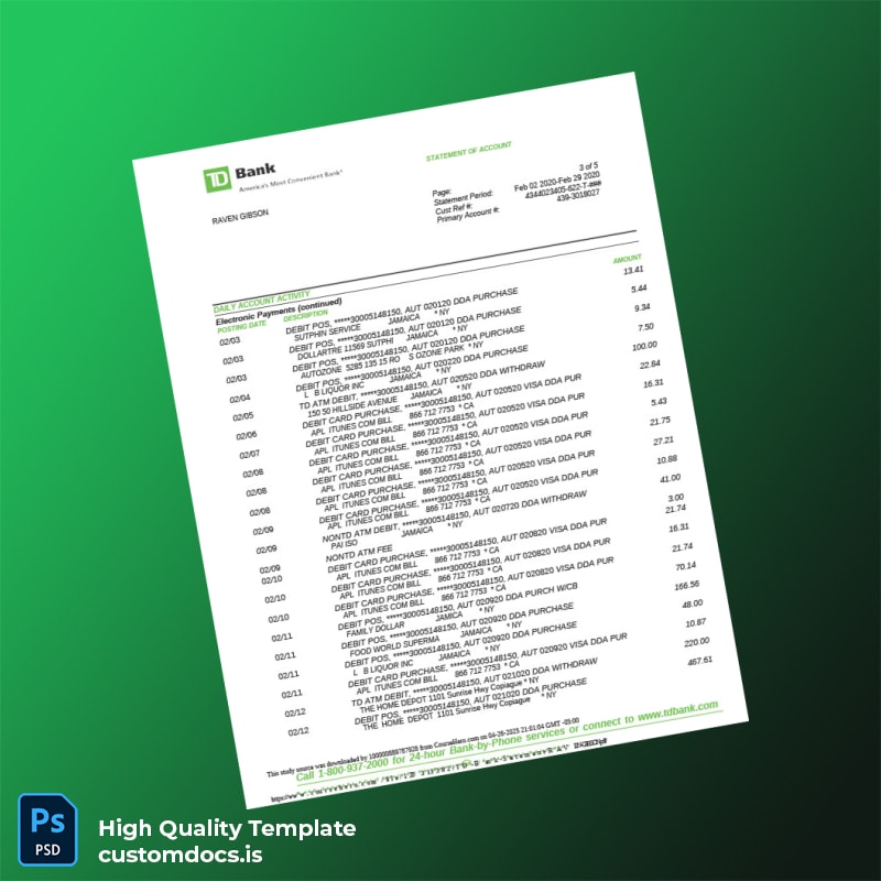 Canada TD Bank Statement Template in Word and PDF formats is meticulously crafted for professionals seeking reliable and editable banking documents. Whether you need a recent statement for an application or to prove your financial history, this template has you covered, offering a hassle-free solution for various administrative needs.