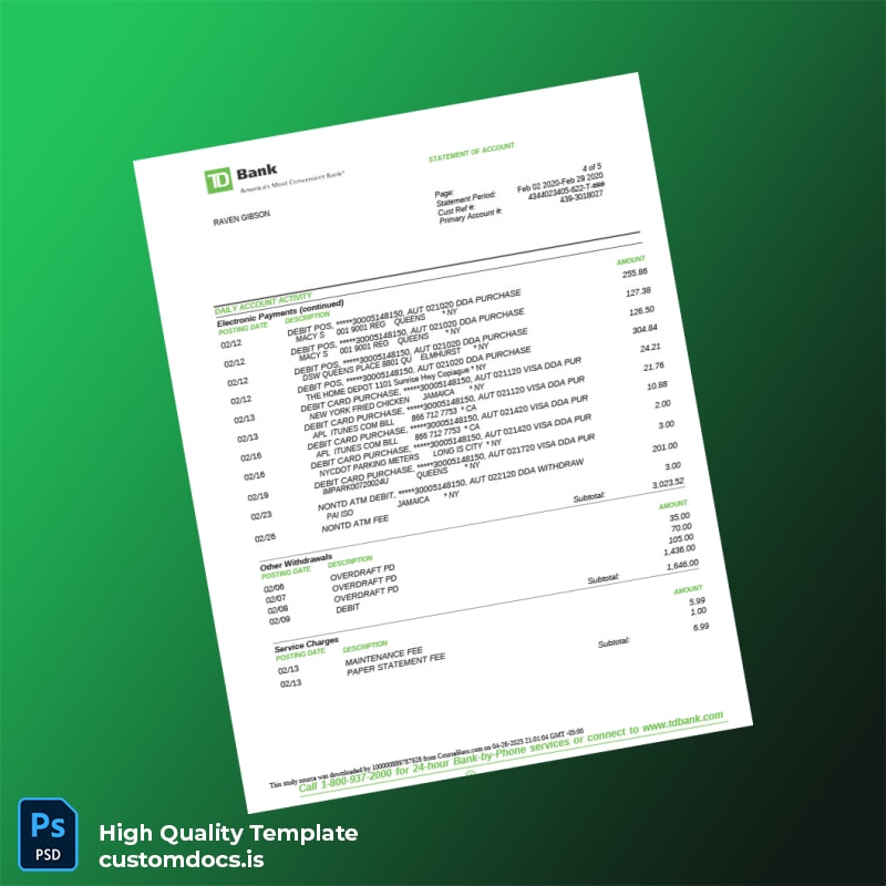 Don’t let the absence of a critical document hinder your professional progress. Download the Canada TD Bank Statement Template now to experience the ease and security of having your banking information at your fingertips. For more adaptable templates, explore our selection of bank statement templates, and finalize your documents with confidence.