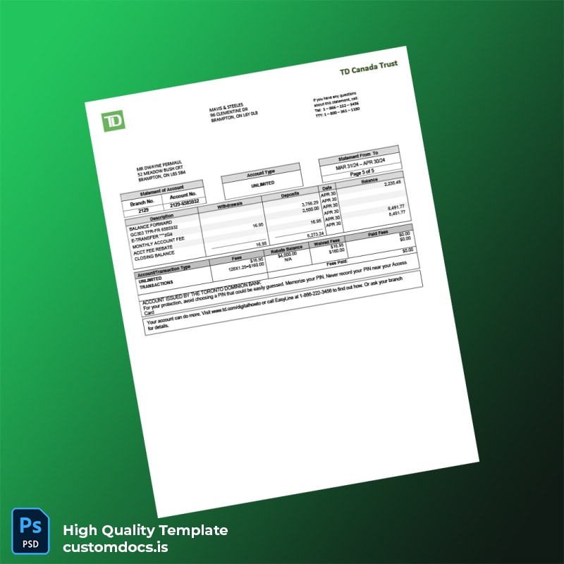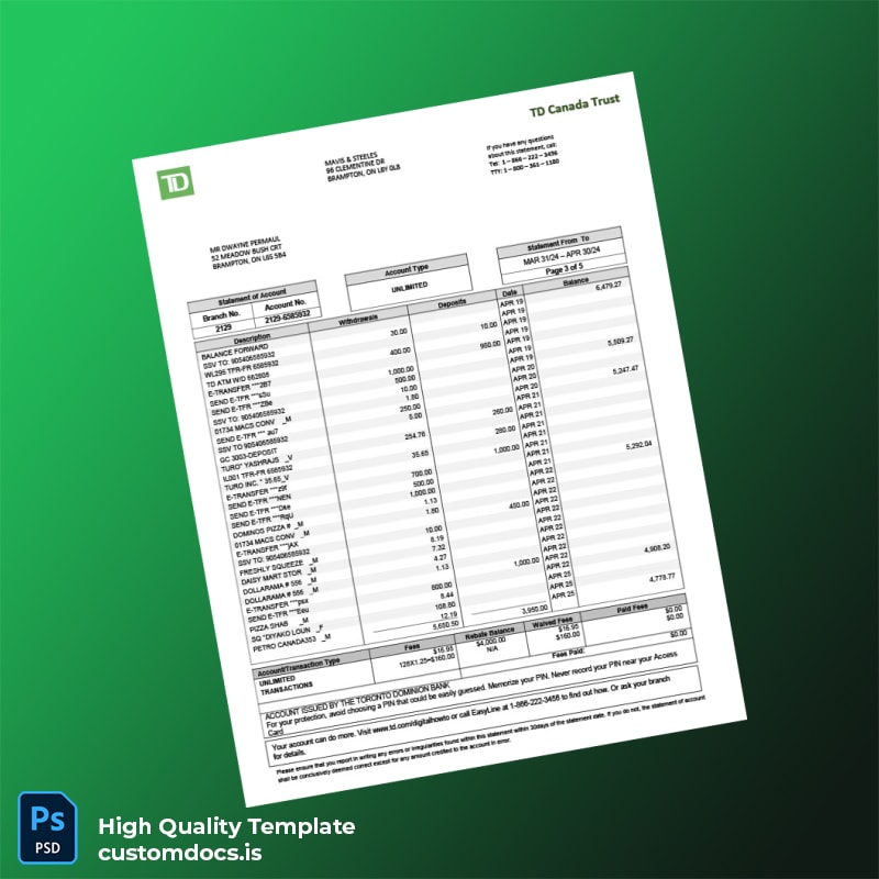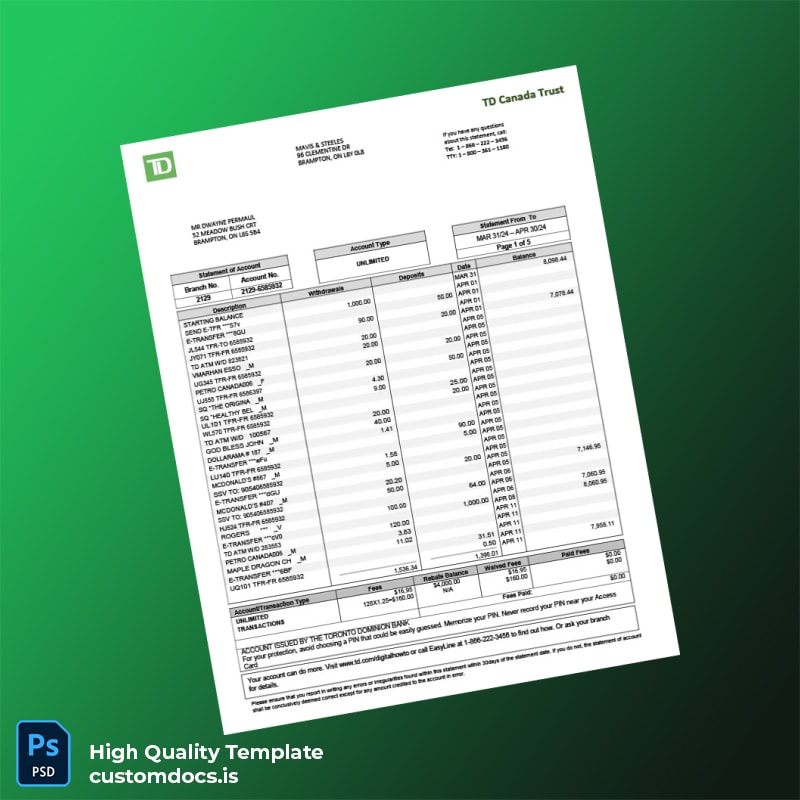 Canada TD Canada Trust Bank Statement Template – Seamless Solutions for Your Banking Needs