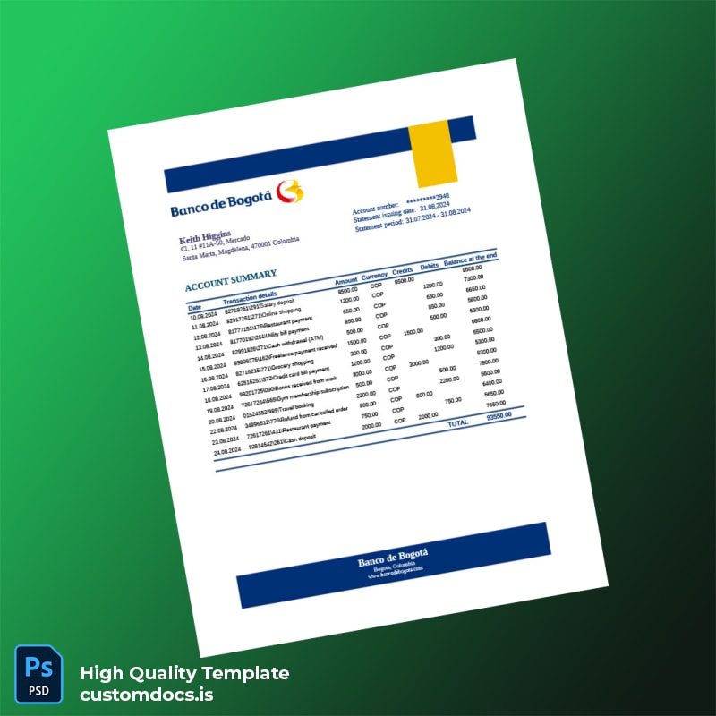 Take control of your proof of address documents today—streamline your verification process with the Colombia Banco De Bogot Editable Bank Statement Template. For a wider selection of editable proofs, explore our comprehensive utility bill template offerings and secure your documentation instantly.