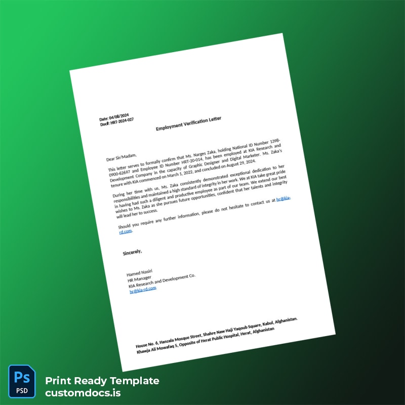 Custom Afghanistan KIA Research and Development Employment Verification Letter Template – Word & PDF 2 page