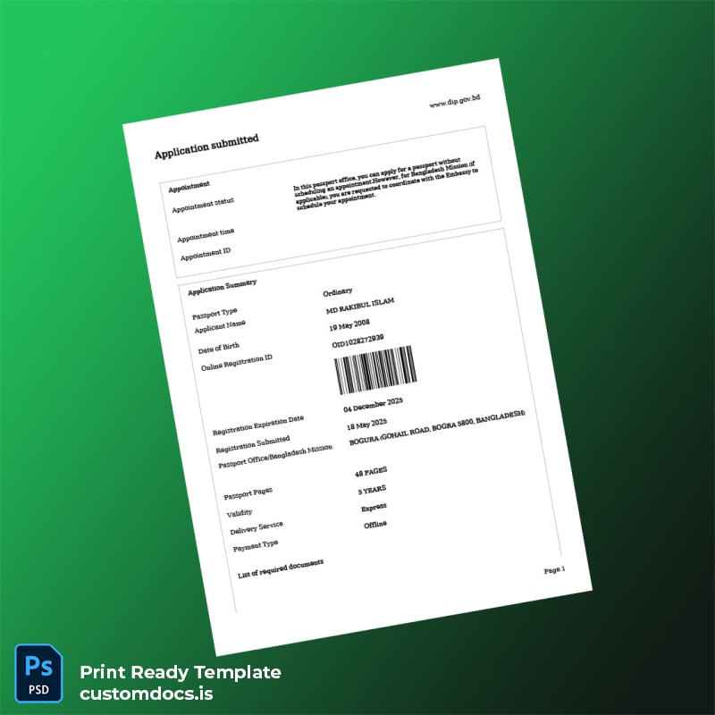 Custom Bangladesh Passport Office Registration Summary Template – Word & PDF 2 page