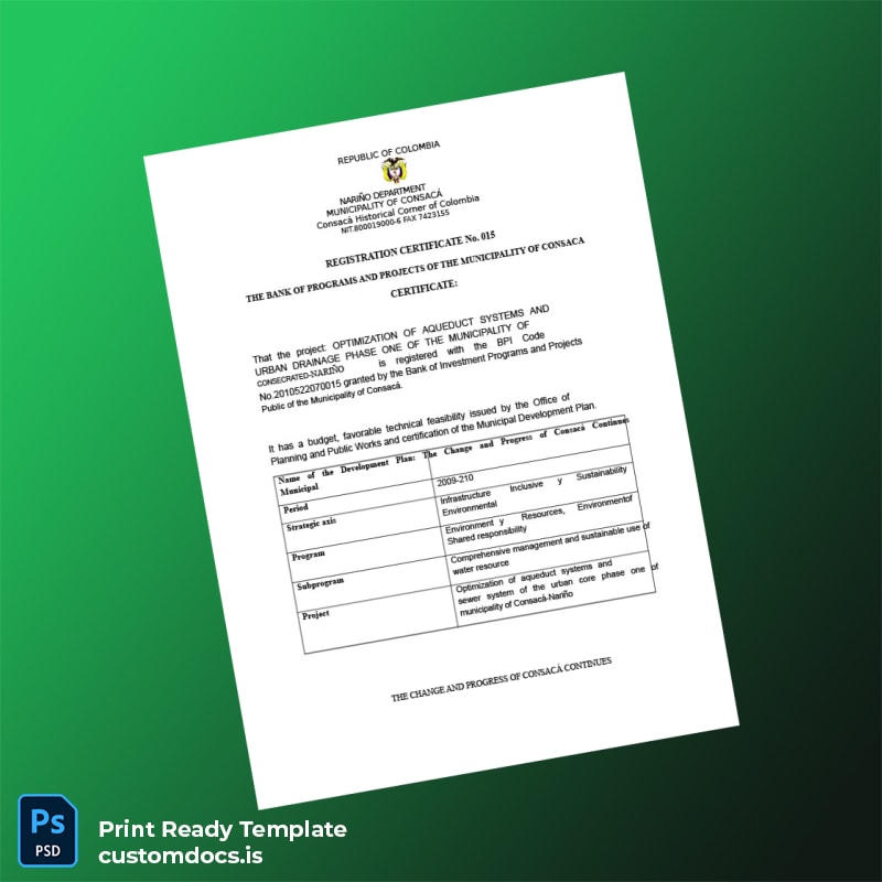Custom Colombia Municipality of Consacá Project Bank Registration Certificate Template – Word & PDF 2 page