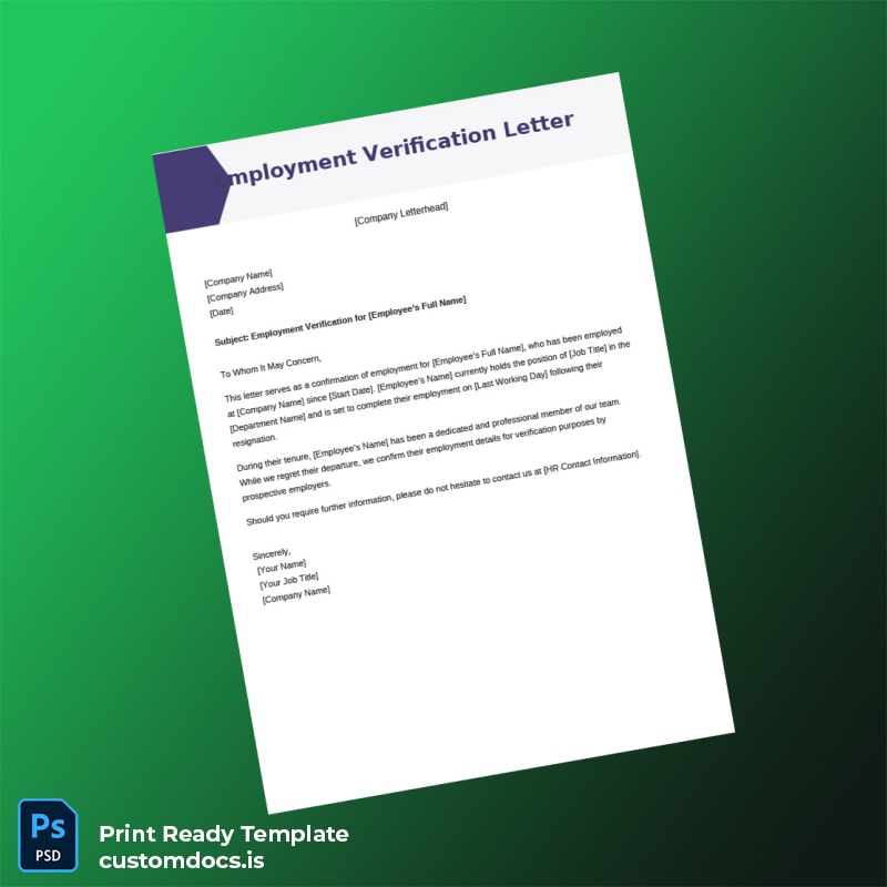 Editable Custom Company Name Employment Verification Letter Word and PDF Template for quick, professional employment confirmation letters.