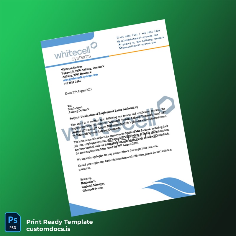 Effortlessly create professional, comprehensive employment verification letters with the Denmark Whitecell System Employment Verification Letter Template. Designed for HR professionals, recruiters, and business administrators worldwide, this customizable Word and PDF template offers a quick solution to providing accurate proof of employment, job confirmation, and certificates of employment.