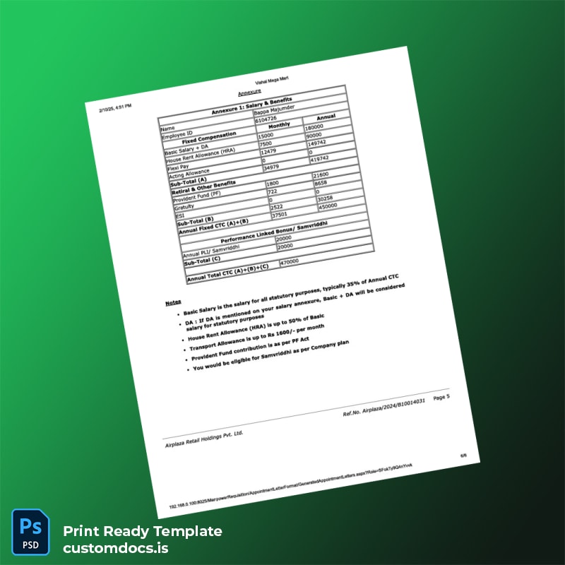 Custom India Airplaza Retail Holdings Pvt Ltd Appointment Letter Template – Word & PDF 6 page