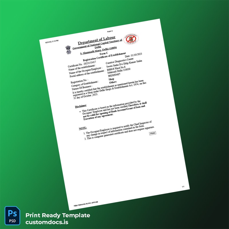 Be the first to review “Custom India Delhi Shops Establishment Act Registration Certificate Template – Word & PDF”