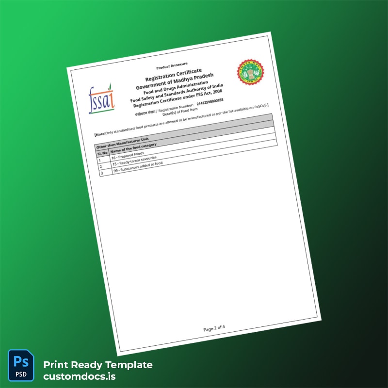 Custom India Food and Drugs Administration Registration Certificate Template – Word & PDF 4 page