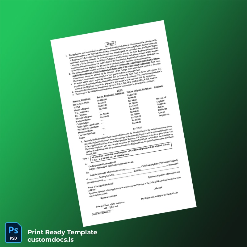 Take control of your application process with this custom India Gauhati University Application for Obtaining Certificate-Diploma Word and PDF template. Simplify your documentation, avoid last-minute hassles, and ensure your registration certificate is correctly submitted. Download your editable and fully customizable template now and experience effortless application management.