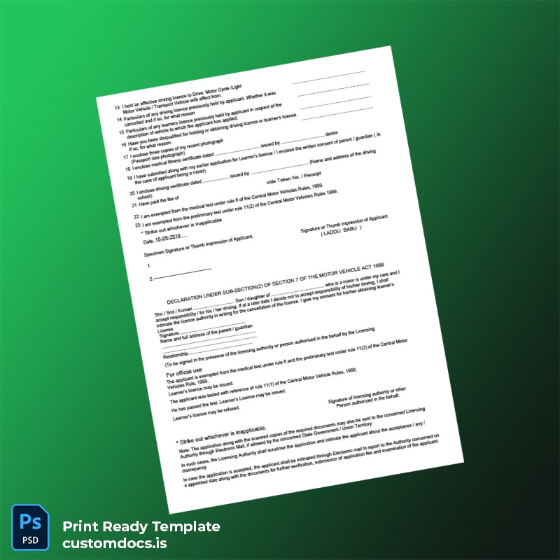 Our India Licensing Authority Learner’s Licence Application Template in both Word and PDF formats offers the perfect solution for professionals seeking a fast, reliable, and editable way to prepare their learner’s licence application. This customizable certificate template allows you to efficiently manage the entire application process without the hassle of starting from scratch, saving valuable time and effort.