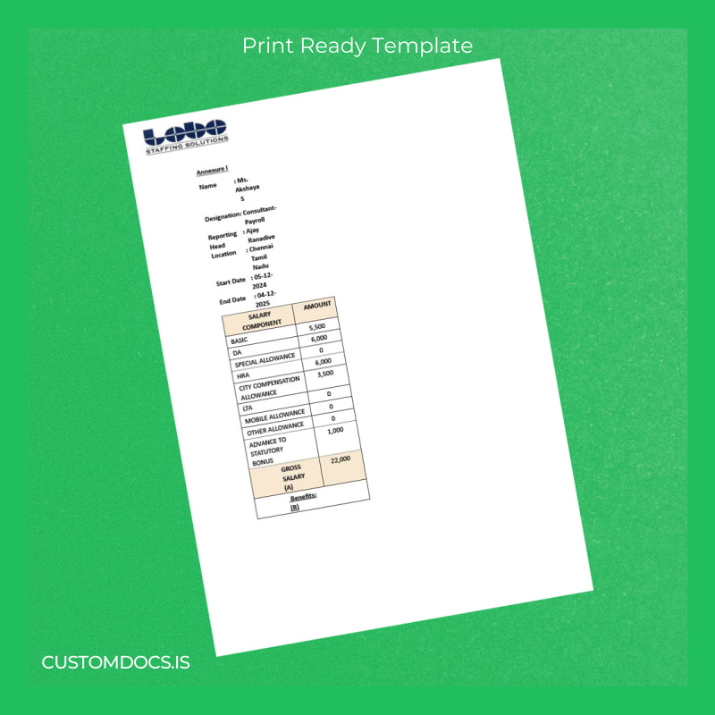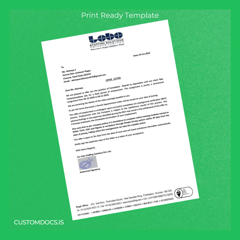 Editable Custom India Lobo Staffing Solutions Pvt Ltd Employment Verification Letter Word and PDF Template ensures fast, professional proof of employment letters.