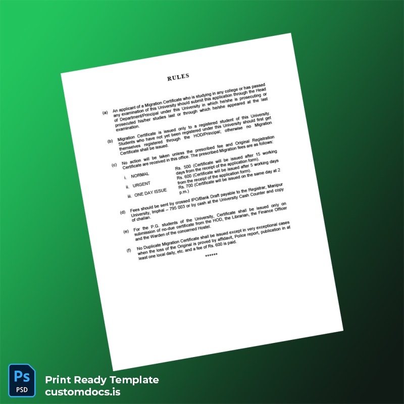 Experience seamless migration certificate application preparation with our Custom India Manipur University Migration Certificate Application Form Word and PDF Template. Designed for academic professionals, administrative staff, and students requiring hassle-free and editable registration certificates, this template ensures efficiency and precision.