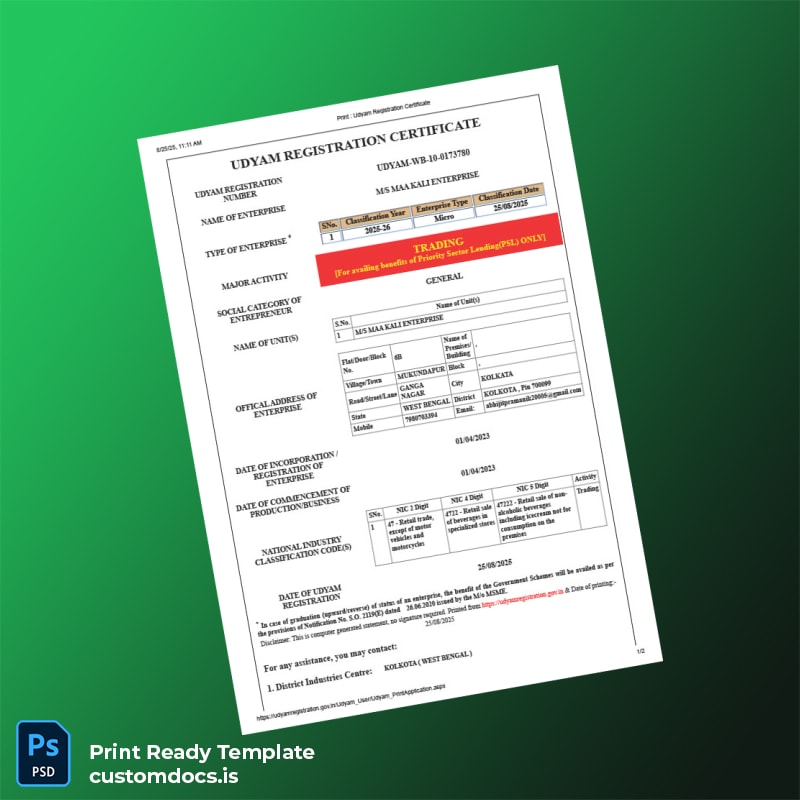 Streamline your business documentation process with our Custom India MSME-DIFO Udyam Registration Certificate Word and PDF Template. Designed for professionals who need a quick and reliable solution to generate accurate and fully editable registration certificates, this template empowers you to take control of your company’s official paperwork efficiently.