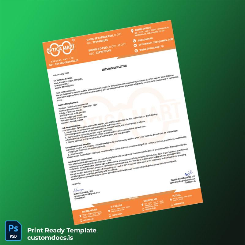 Custom India Opticamart Employment Verification Letter Word and PDF Template – editable & customizable for quick, professional proof of employment documents.