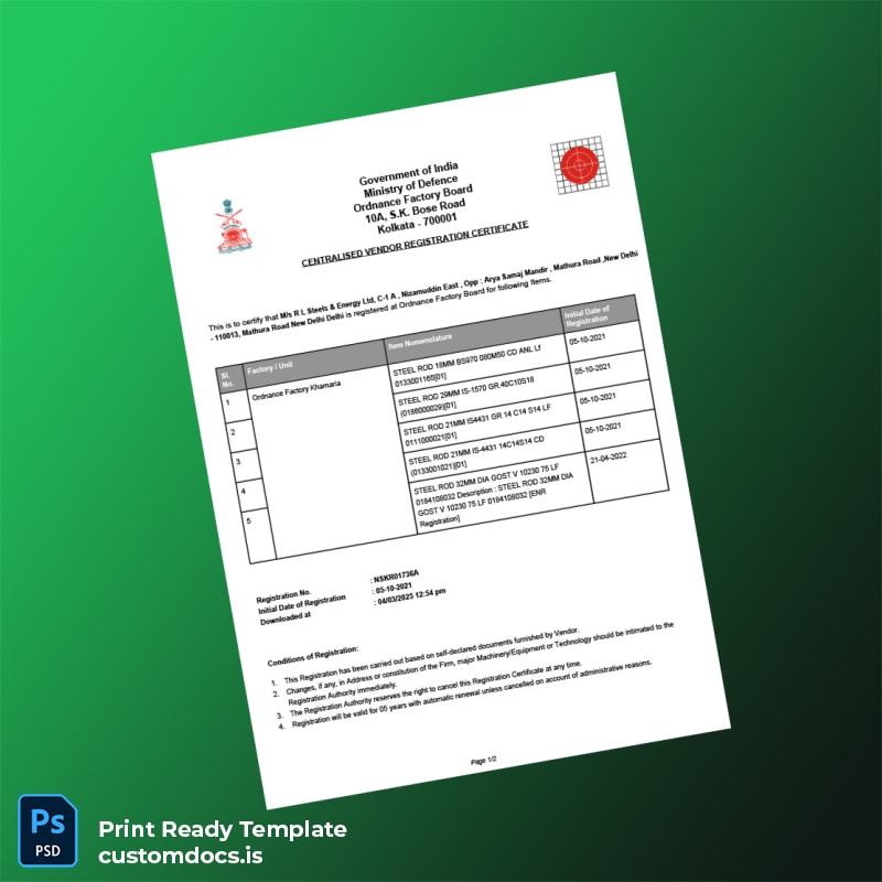 Whether you require a quick company registration form PDF download or need a trusted certificate template Word format to streamline your application process, this Custom India Ordnance Factory Board Combined Registration Certificate Template empowers you with flexibility and professionalism. Don’t let paperwork slow you down—download your editable, customizable template now and secure your business credentials with confidence.