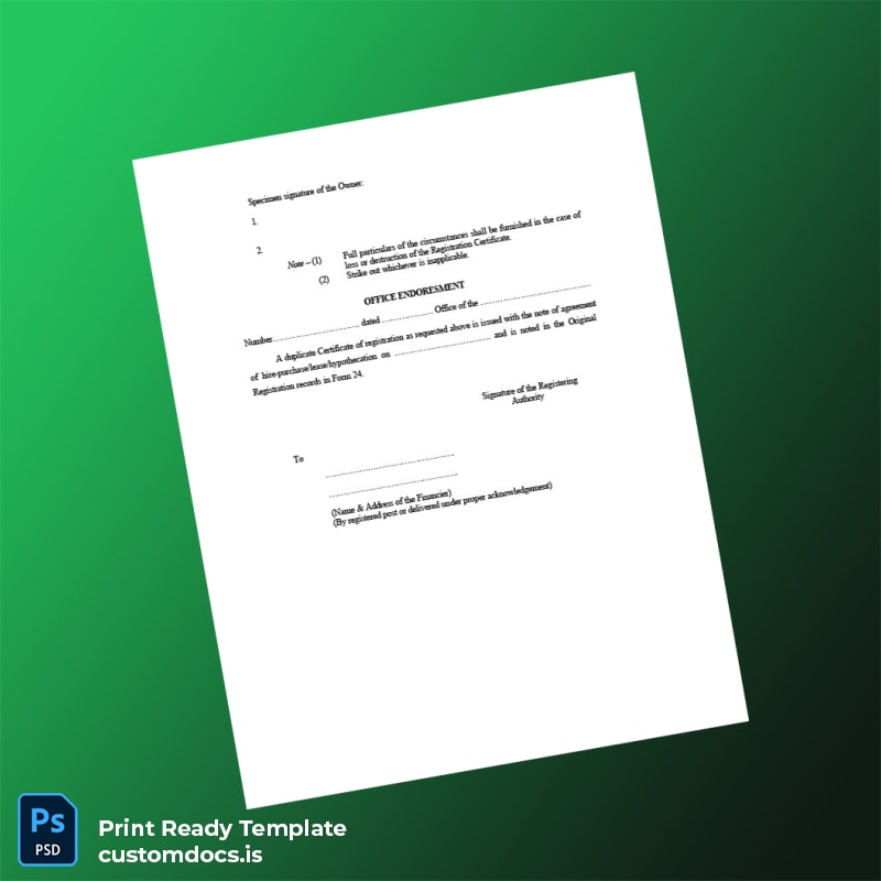 Replacing a lost or stolen vehicle registration certificate can be a stressful and time-consuming process. The India Registration Authority Duplicate Vehicle Registration Certificate Template – Word & PDF is designed to simplify this task for individuals and businesses alike, providing a fully editable and professional solution that meets official requirements.