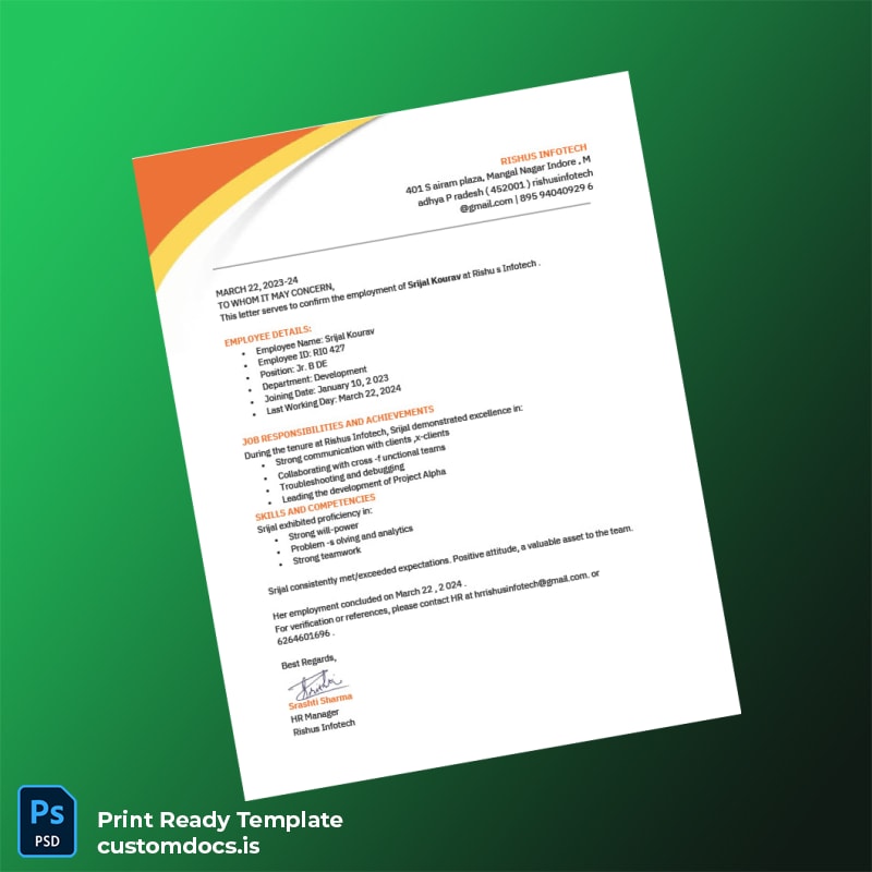 Take control of your employment verification tasks today with India Rishu s Infotech’s editable and customizable template. Purchase now to experience the ease of producing polished, accurate employment letters that meet your professional needs flawlessly.