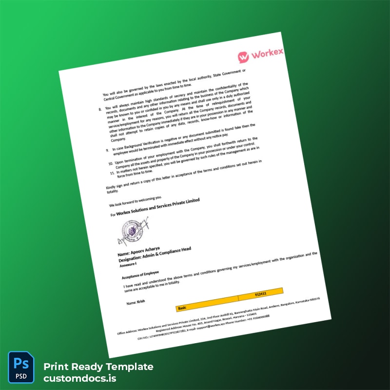 Don’t let documentation complexities slow down your professional processes. Invest in the India Workex Solutions and Services Private Limited Offer Letter Template now, edit it to suit your needs, and produce polished, trustworthy letters with ease. Streamline your human resources workflow with this essential customizable digital resource and deliver precise employment verification every time.