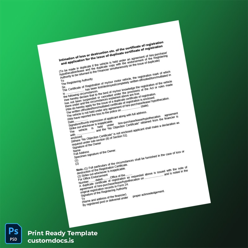 Facing the challenge of lost or destroyed registration certificates can be daunting for any business professional. Our Intimation of Loss or Destruction of the Certificate of Registration and Application for the Issue of Duplicate Certificate of R Template in Word and PDF formats offers an efficient, editable solution to streamline the replacement process, ensuring you regain compliance quickly and reliably.