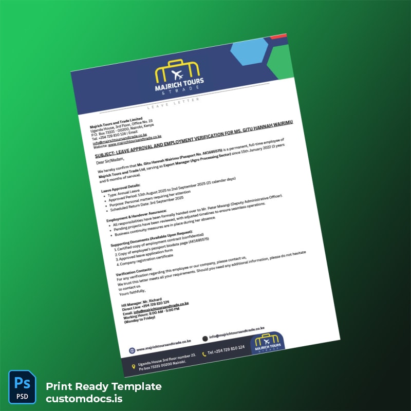 Securing a reliable and professional employment verification letter is crucial for many professionals needing to confirm their job status quickly. The Kenya Majirch Tours and Trade Ltd Employment Verification Letter Template in Word and PDF formats offers an efficient, customizable solution for businesses and individuals alike.