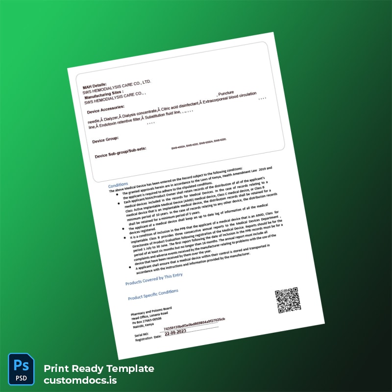 Understanding the challenges professionals face — such as misplaced certificates, expired documents, or urgent compliance requirements — this template addresses critical needs by providing a ready-to-use, editable registration certificate template compliant with Kenya’s regulatory framework. It saves time, reduces errors, and allows businesses to maintain uninterrupted operations in the medical device sector.