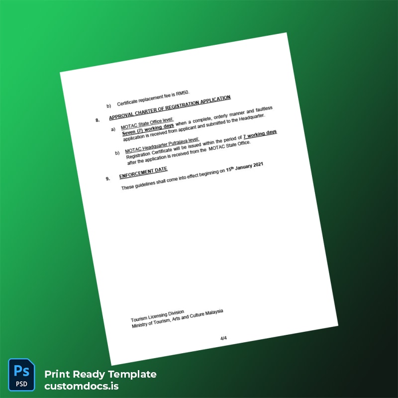 Custom Malaysia Tourism Ministry Registration Certificate Template – Word & PDF 4 page