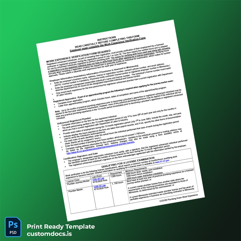 Be the first to review “Custom Minnesota Plumbing Work Experience Verification Form Template – Word & PDF 2 page”
