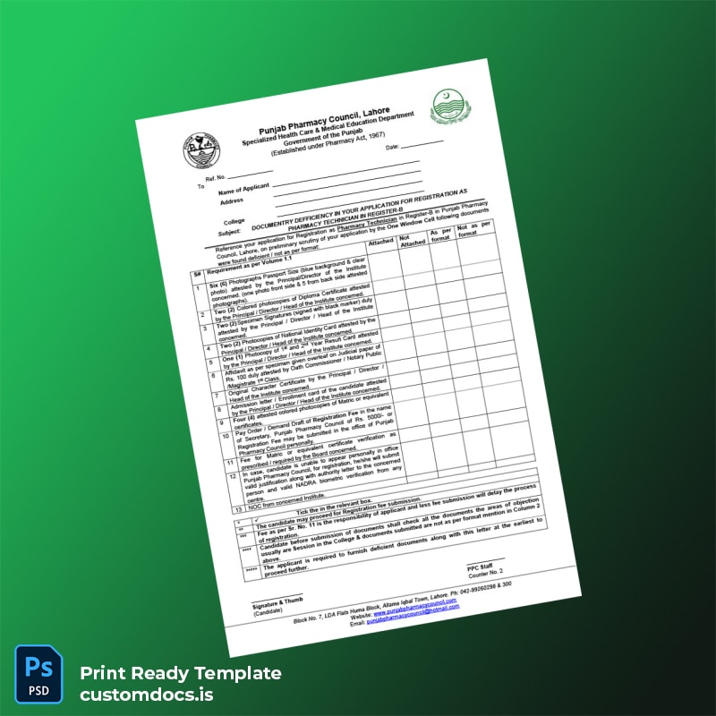 The Pakistan Punjab Pharmacy Council Registration Form Template – Word & PDF offers a comprehensive and editable solution for professionals seeking a hassle-free and customizable registration certificate. Designed specifically for pharmacy professionals and business owners in Pakistan, this template simplifies the process of obtaining an official registration certificate by allowing you to edit all necessary fields efficiently in Word or PDF format.