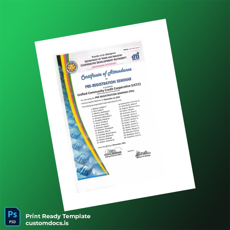 Don’t let paperwork slow down your cooperative’s growth. Download the Custom Philippines Cooperative Development Authority Pre Registration Certificate Word and PDF Template to experience the confidence that comes with having a polished, editable, and official-looking certificate at your fingertips. Start your cooperative journey the smart way—order now and simplify your business registration process today.