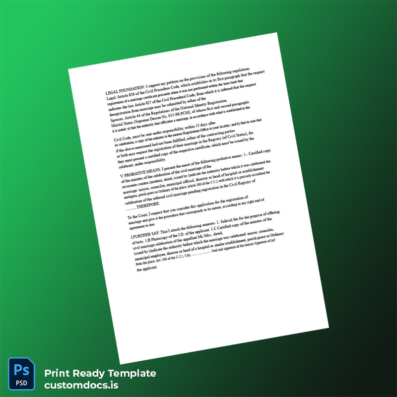 Effortlessly manage the administrative essential of registering a marriage certificate with our professionally crafted Request for Registration of Marriage Certificate Template – Word & PDF. Designed to provide clarity and ease, this template addresses the urgent need for accurate documentation whether you are a legal professional, registry office staff, or an individual managing personal records.