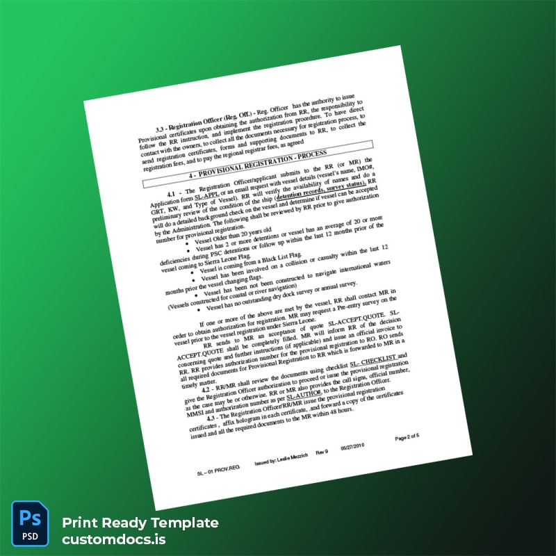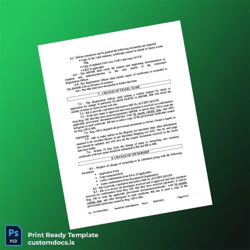 Stop wasting time on complex document formatting or expensive professional services. Experience the convenience of an editable, easy-to-use registration certificate template designed specifically for Sierra Leone’s maritime sector. Download your custom Sierra Leone Maritime Registry Provisional Registration Certificate Word and PDF Template now and ensure your maritime operations stay fully compliant and professionally certified.
