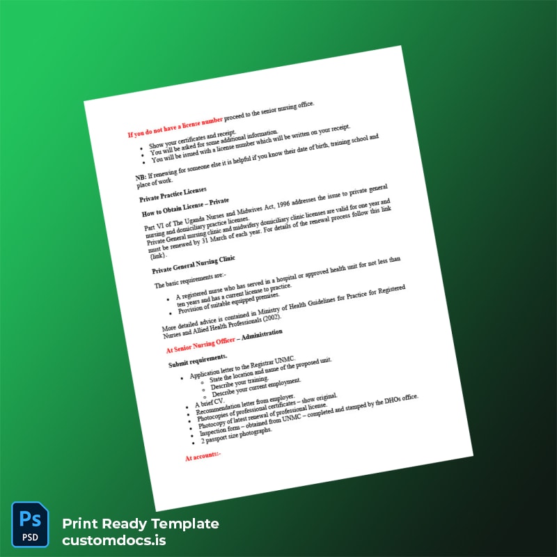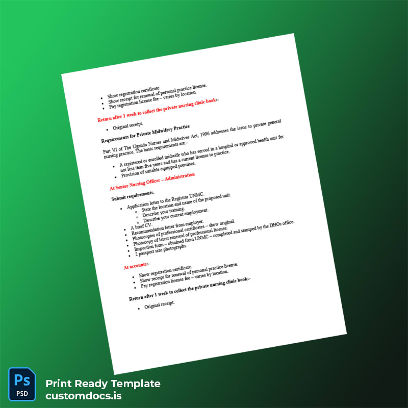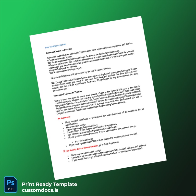 Designed specifically for healthcare professionals in Uganda, this certificate template addresses critical pain points like document loss, expiration, or the need for quick replacements without bureaucratic hassle. It’s also ideal for those seeking a professional and polished registration certificate without the need to engage costly designers or legal services. By using an editable format, you save time and money while maintaining official document standards.
