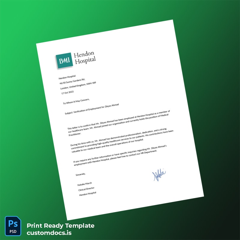 Custom United Kingdom Hendon Hospital Employment Verification Letter Template – Word & PDF