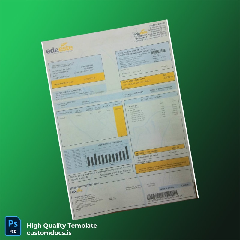 - Authentic layout matching Dominican Republic EDE Este utility bills to ensure credibility and acceptance.