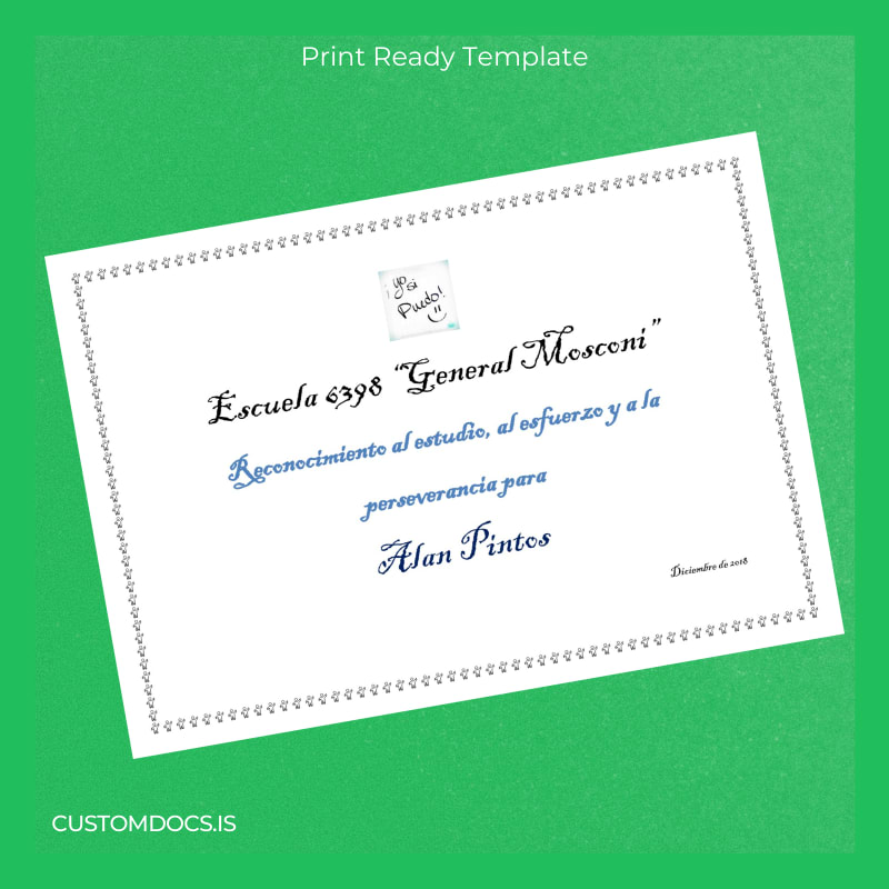Skip the frustrating wait times and complex procedures by using the Argentina Escuela 6398 General Mosconi Recognition Diploma Template – Word & PDF, an expertly designed digital diploma download. This editable diploma template allows you to swiftly customize all necessary details to fit your personal or institutional needs, getting you back on track with ease. For more options on editable and customizable diplomas, explore our customizable degree template category.