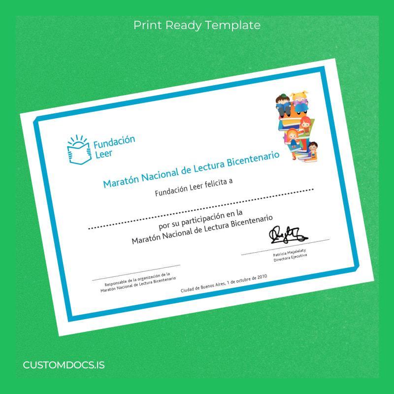 Download Argentina Fundación Leer Participation Certificate in the Bicentennial National Reading Marathon Template – Word & PDF – Instant Digital File