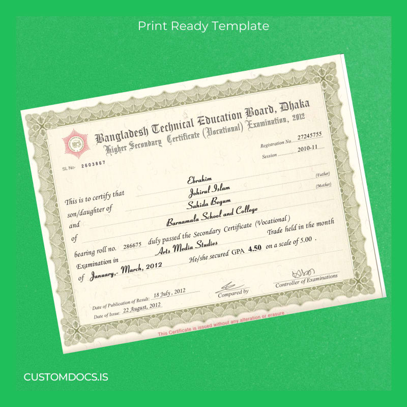 Save time and avoid the headaches usually associated with replacing official documents by opting for this instantly accessible, elegantly designed Bangladesh Barnamala School and College Higher Secondary Certificate Vocational Template. Its adaptability and professional layout make it the ideal tool for swift diploma recreation.