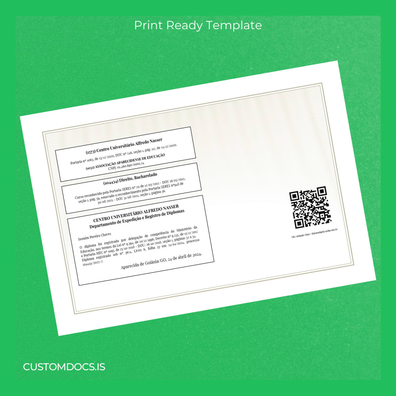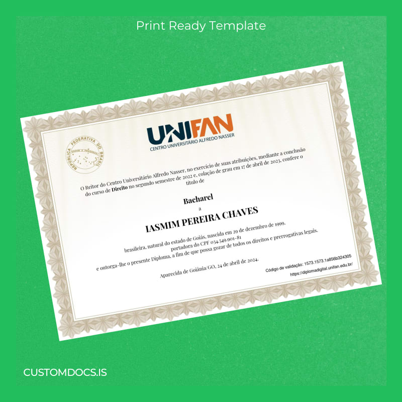 Don’t let lost or damaged diplomas jeopardize your career progression. The Brazil Centro Universitário Alfredo Nasser Bachelor of Law Diploma Template – Word & PDF offers a swift and practical solution for professionals requiring a reliable and customizable diploma form. This template is designed for easy editing and high-quality output, ideal for those who need to reproduce an accurate and professionally styled document promptly.