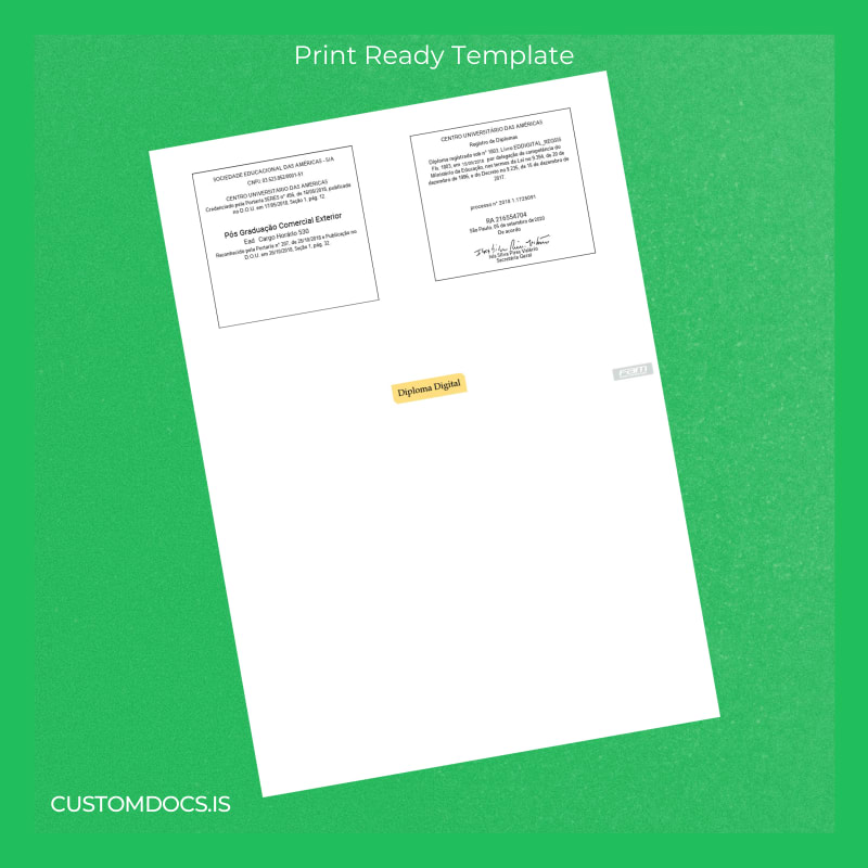 With the customizable degree template approach, you gain immediate access to a fully editable and professional-quality Brazil Centro Universitário das Américas Postgraduate Diploma in International Business Template – Word & PDF. This template is designed for professionals who require a swift, reliable, and legally styled replacement diploma. Whether you need to update your credentials for career advancement or academic purposes, this digital download empowers you to handle your document needs without unnecessary delays.