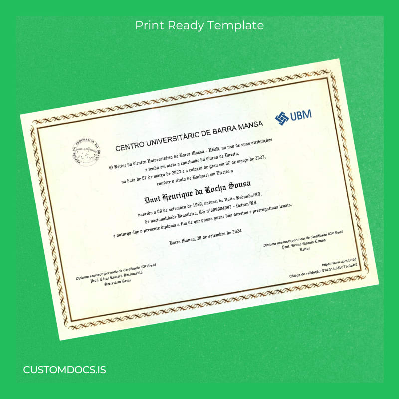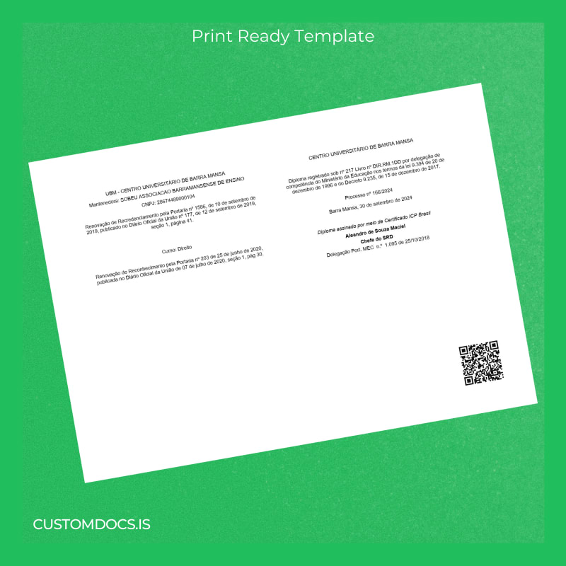 The Brazil Centro Universitário de Barra Mansa Bachelor of Laws Diploma Template – Word & PDF is designed for immediate, hassle-free editing and printing, offering a practical alternative to waiting for official reissuance. Ideal for professionals or graduates who require a clean, authentic-looking document promptly.