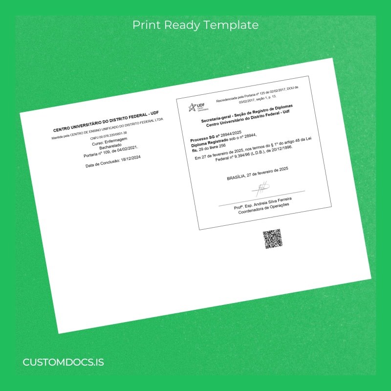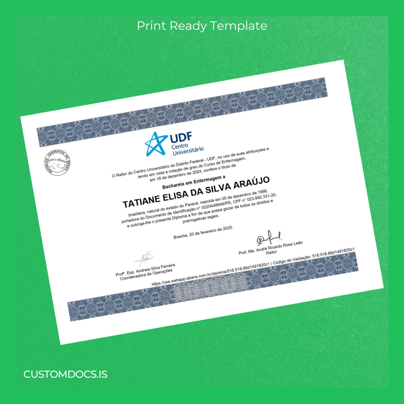 This customizable degree template offers a seamless, high-quality solution. Designed specifically for the Brazil Centro Universitário do Distrito Federal Bachelor of Nursing credential, this editable diploma template allows complete control over all text fields. Whether you need a blank diploma form for new entries or a replacement diploma template, this digital download is crafted to save time and meet your professional standards.