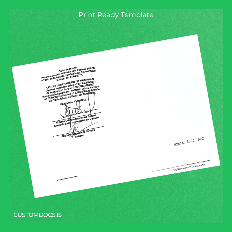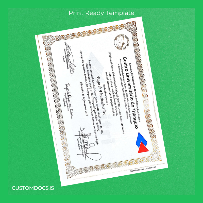 Our editable diploma template provides a fully customizable and printable solution specifically designed to replicate the Bachelor of Law Diploma from Brazil Centro Universitário do Triângulo. This customizable degree template allows legal professionals, graduates, and students to quickly obtain a high-quality diploma replica that suits your immediate needs.