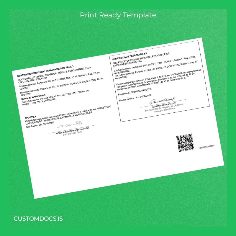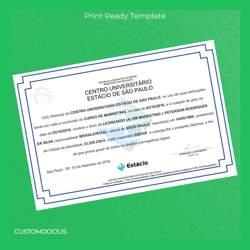 Our customizable degree template, the Brazil Centro Universitário Estácio de São Paulo Bachelor of Marketing Template – Word & PDF, offers an immediate, print-ready solution designed specifically to replace or recreate your diploma quickly. This digital download features an editable layout compatible with widely used Word and PDF formats, allowing you to personalize every detail seamlessly to match official documentation.